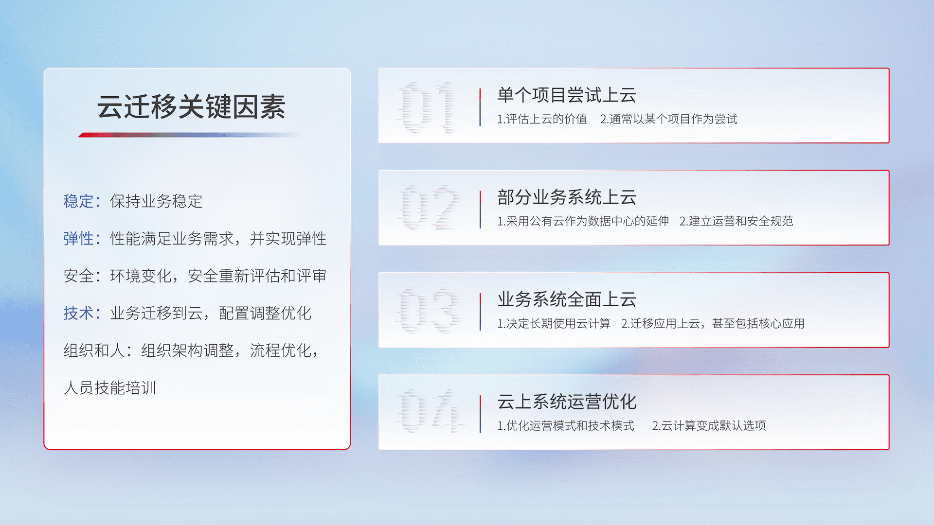 结合实际业务,,,从规划设计、、云平台选型、、、云原生改造、、数据迁移、、、集成交付,,,迁移全过程为客户识别最佳上云路径,,,,做好风险识别管理,,设计网络架构、、、身份权限、、、安全审计合规、、、操作审计、、日志审计、、、监控告警策略、、、、多站点容灾设计等,,,对云上基础设施进行整体规划,,,提升IT治理水平,,,,以满足弹性、、、、高可用、、高性能的需求。。
