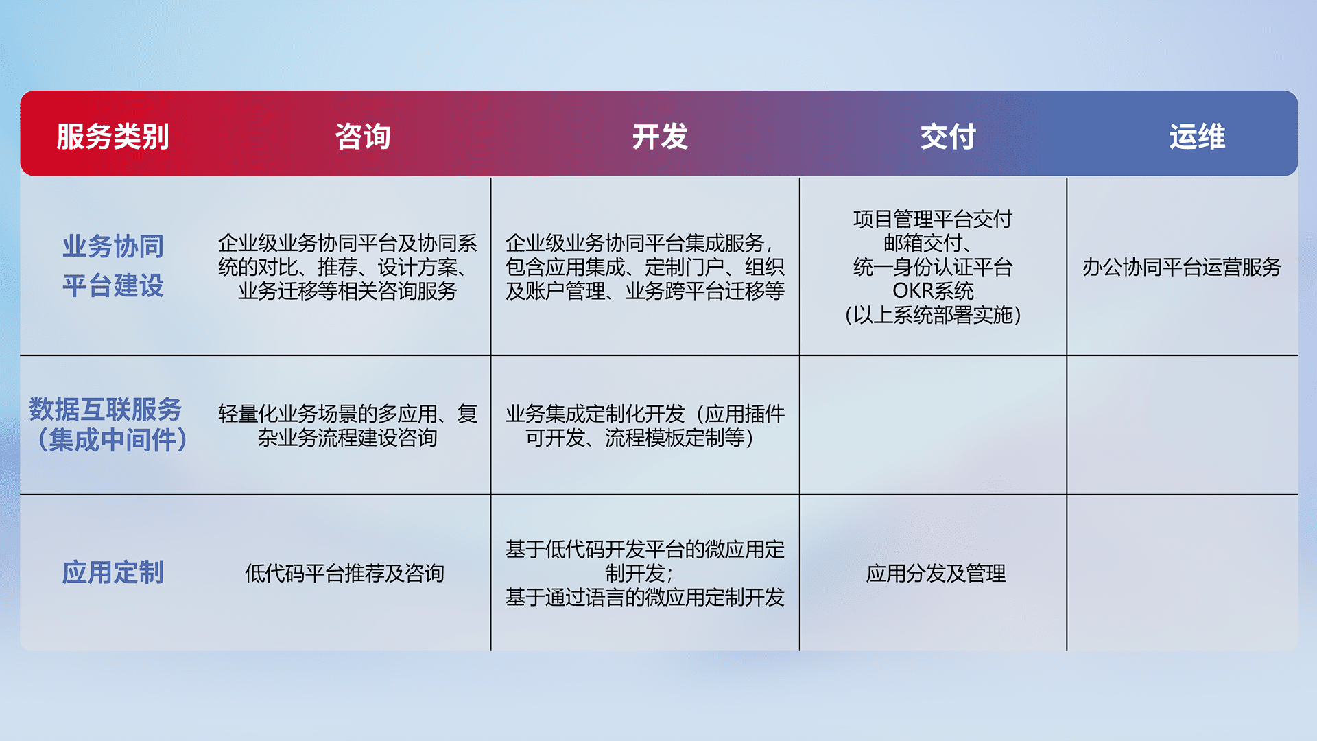 针对钉钉、、、企微、、、、IDaas等平台级产品提供产品的规划、、、、方案、、、、交付、、、定制化开发等服务,,,,实现如统一协同办公、、、、智能客户服务、、混合会议管理、、、、智能数据查询、、、、等业务场景,,,实现数字化转型。。
